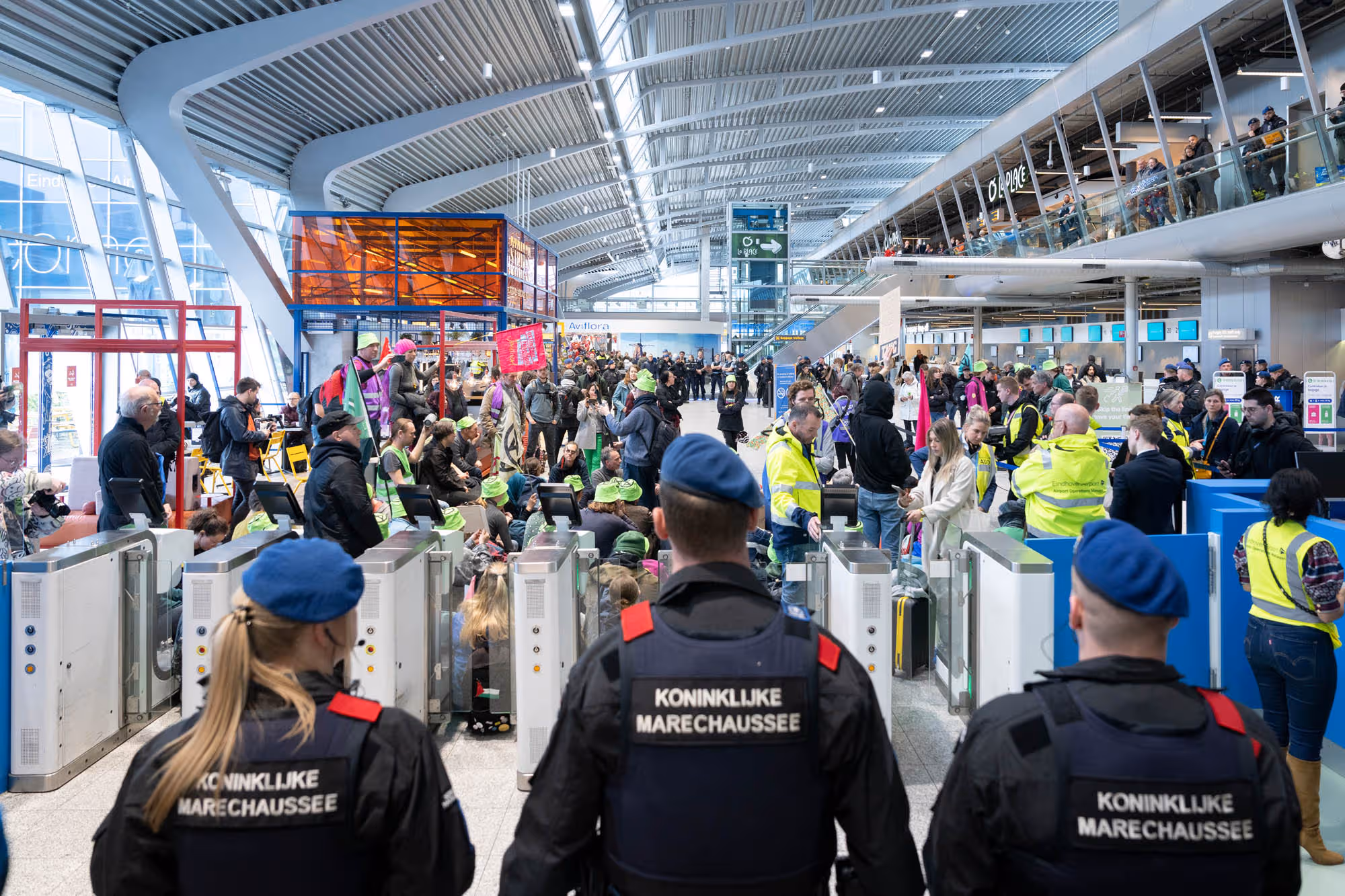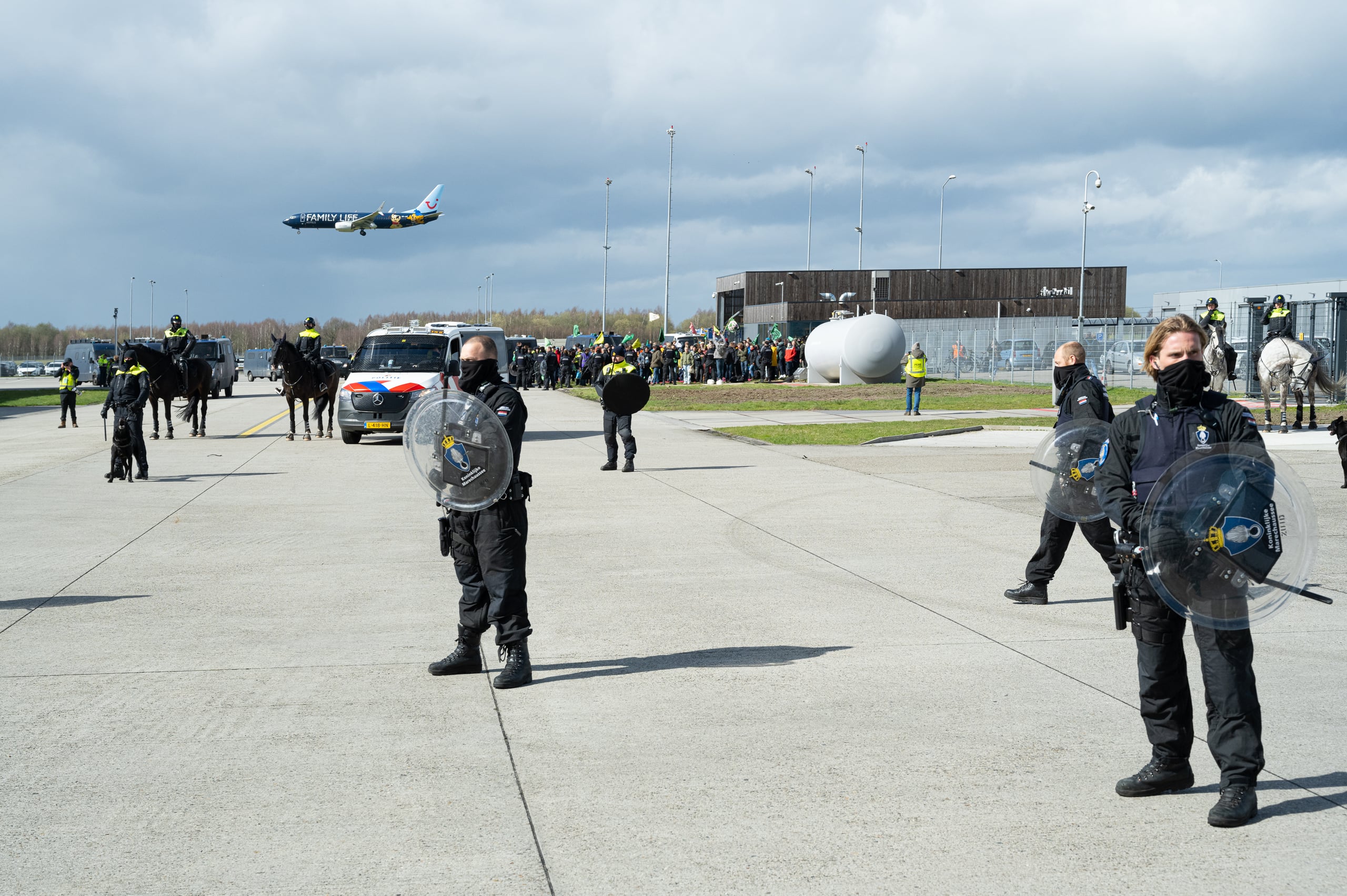 Marechaussee en politie samen aan de lat bij grote demonstratie Eindhoven Airport